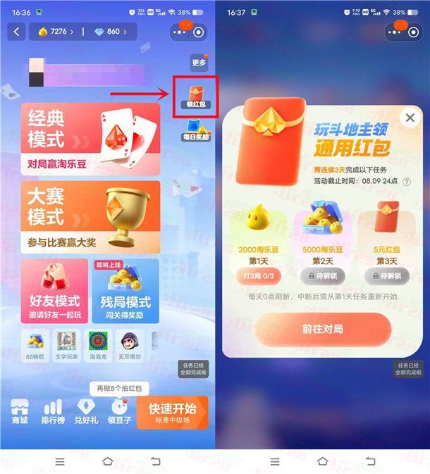 参加淘宝举办的玩斗地主领5元红包活动,通过打开淘宝APP进去活动里,部分用户点击右侧的图标【领红包】进去参加,每天完成指定的对局任务,连续3天完成任务可以领到5元淘宝通用红包,这个活动只有部分用户才会有这个入口,如果没有入口就参加不了。