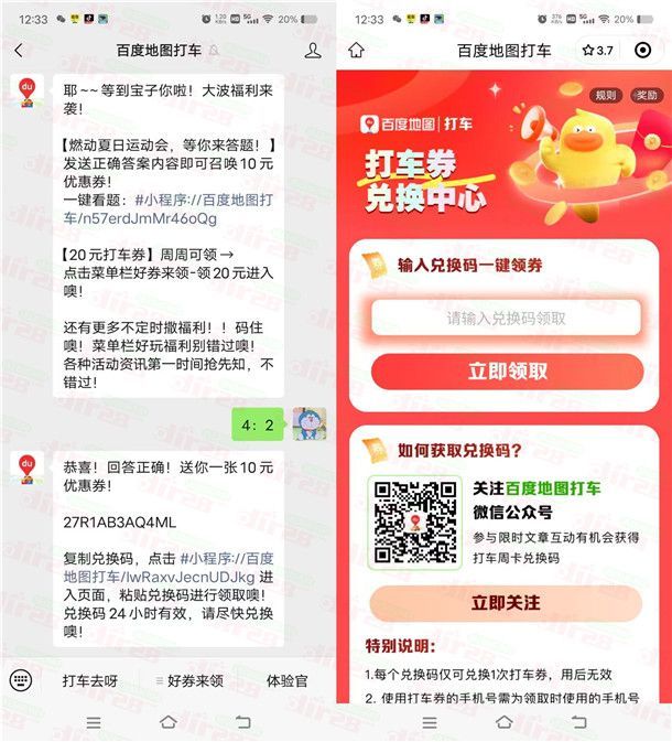 小编提示:关注公众号“百度地图打车”回复“4:3”参加,可获得一张10元百度地图打车券,按照提示进去兑换就行,如果是首次参加是满5元可用,不是首次参加是满15减10元