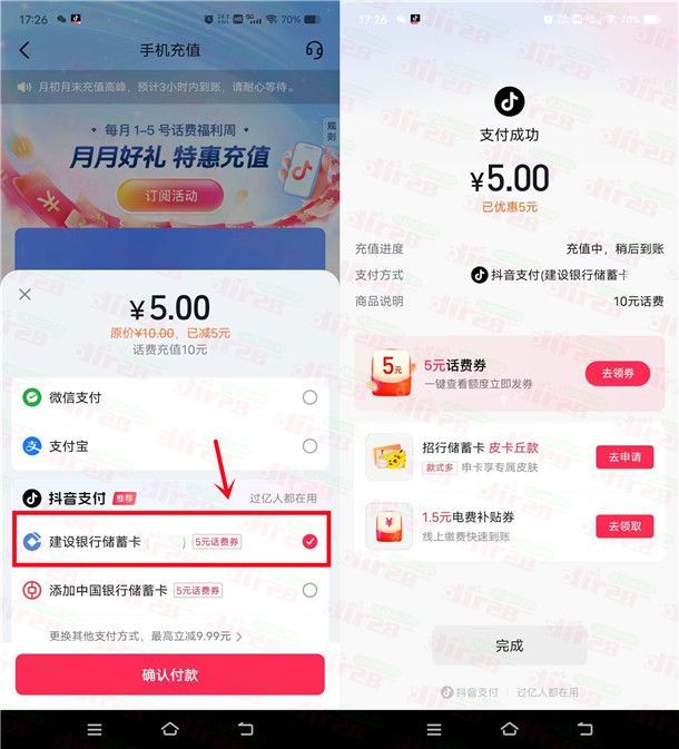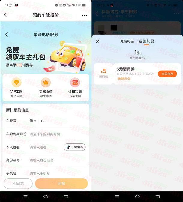 这是抖音的一个预约车险报价的活动,通过打开抖音APP进去活动里,再活动里除了手机号其他都可以乱,提交会得到一张5元话费券,然后就可以在抖音APP里充10元话费抵扣(选择银行卡付款就可以抵扣),小编测试充值的10元话费目前秒到,数量限量。