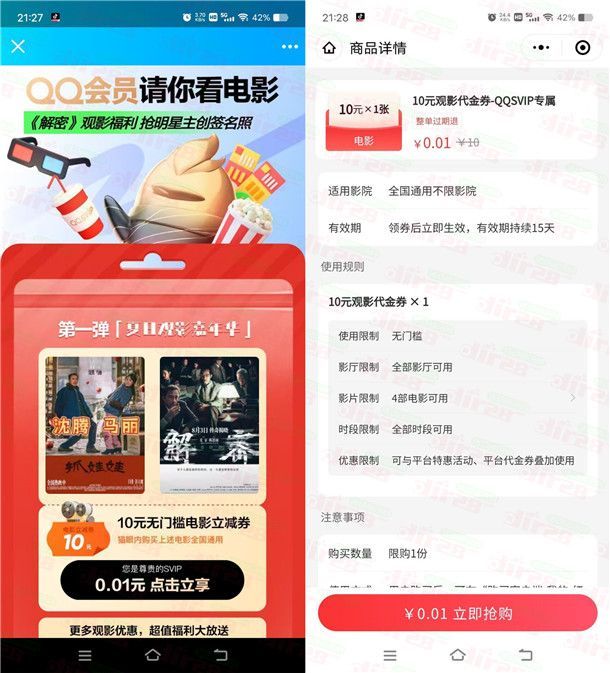 参加QQ超级会员举办的请你看电影活动,通过打开手机QQ进去活动里,QQ超级会员跳转到微信支付0.01元可以购买10元猫眼无门槛通兑券,可以在猫眼购买电影票抵扣,有QQ超级会员的都可以去,正好马上七夕了,可以跟对象一起到电影券去看个电影。