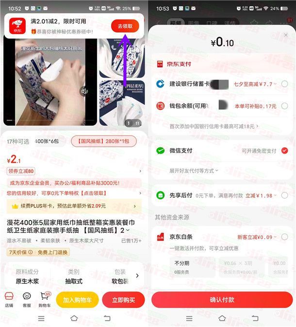 京东部分用户0.1元购买1包漫花抽纸包邮 简单领2元优惠券活动