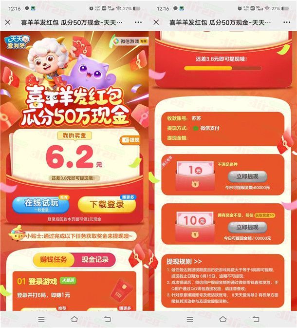 参加天天爱消除举办的喜洋洋发红包瓜分50万现金活动,通过打开微信和手机QQ进去活动里,首次进去会得到6.3元红包金额,完成页面指定的任务、以及邀请好友助力可以增加机会,新用户1元就可以提现,老用户满10元提现,微信和QQ都可以去,红包数量限量。