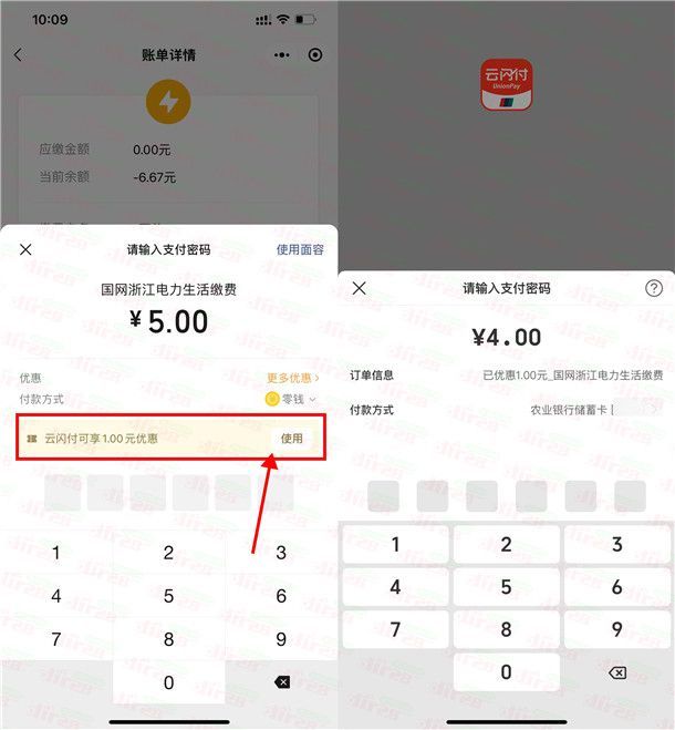 微信4充5元水电费 简单云闪付付款立减1元活动