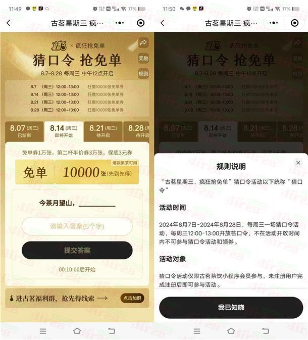 古茗微信小程序猜口令活动抢1万份奶茶免单 每周三12点整开始
