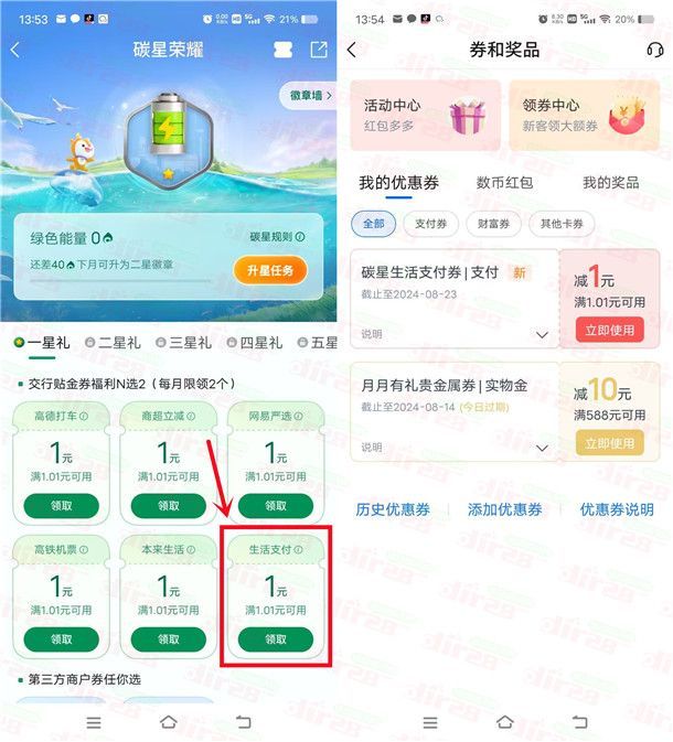 1、打开交通银行APP搜索【碳星荣耀】进去,根据你的星级等级可以领到1-5元生活支付红包(直接领1元生活支付红包就行)