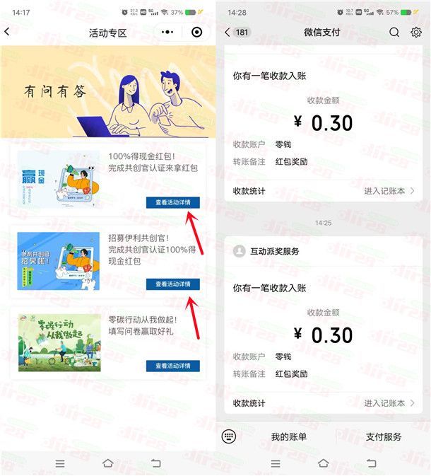 活力伊利微信小程序的多个简单问卷抽红包的活动,通过打开微信进去小程序活动里,里面2个共创官的现金红包问卷都可以去参加(必须要添加里面的企业微信才可以抽奖,不添加是抽不了的),答完几道问卷题提交后就可以抽奖,有机会中到0.3-88元微信红包,小编测试中到2个0.3元。