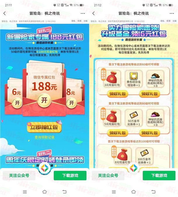 冒险岛周年庆微信手游新老用户领6-188元微信红包 数量限量