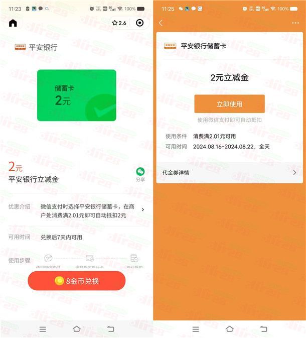 这是微信支付有优惠小程序里的一个兑换活动,通过打开微信进去小程序里,可以直接用8个金币兑换2元平安银行微信立减金,如果没有金币的可以点击小程序左上角图标进去大小号相互赠送金币,注册过平安口袋银行二类电子卡的去。