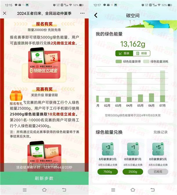 小编提示:复制链接到微信打开进去报名,然后点击左侧图标【报名有礼】就会得到5000个绿色能量(价值2元),完成5000步数还可以领取25000个绿色能量(价值10元),绿色能量可以直接去中国工商银行APP绿色能量页面兑换微信立减金,如果兑完完了也可以等下次补充库存再兑换,数量限量