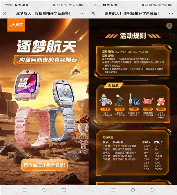 小天才逐梦航天组队抽0.58-5.88元微信红包、实物 亲测中0.58元