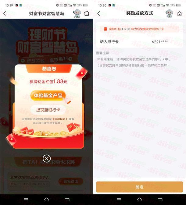邮储银行理财节答题领1.88元现金红包 可直接提现到银行卡