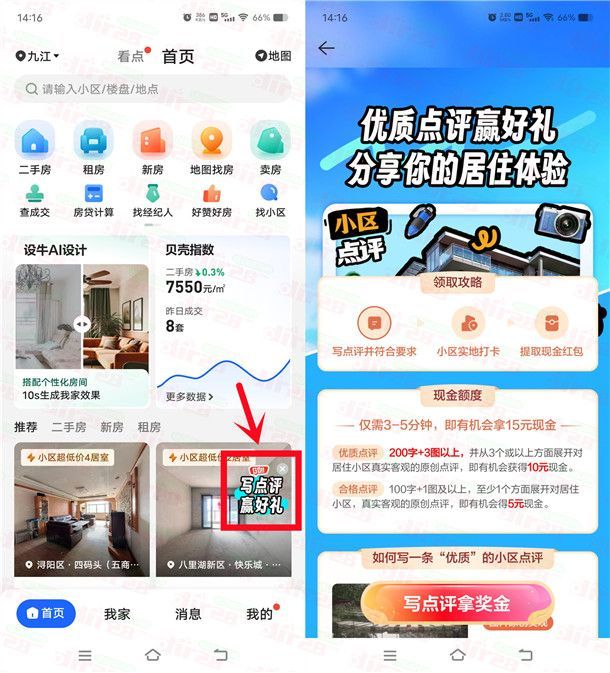 小编提示:打开“贝壳找房”APP,首页点击右侧悬浮图标【写点评赢好礼】进去,按照提示写小区点评(200字+3张图)送5-15元现金红包,合格点评给5元、优质点评再给10元,最好写自己周边小区的点评,审核通过后可领取现金红包