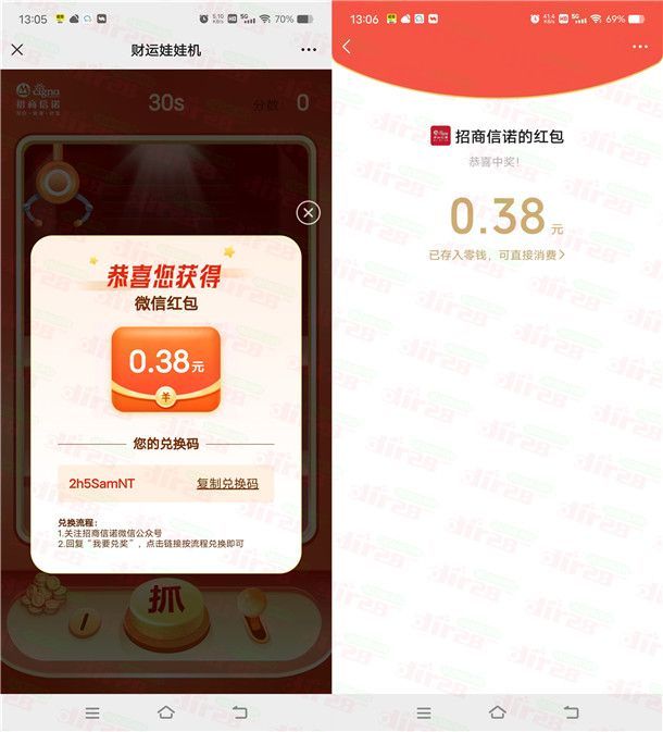 参加招商信诺举办的财运娃娃机小游戏抽红包活动,通过打开微信进去活动里,小游戏开始挑战后用户需在30秒内抓取一诺小精灵,成功抓取1个加10分,得分大于或等于30分即可抽奖,挑战机会每人每天默认拥有2次,完成一个简单的浏览任务还可以增加1次机会,有机会中到0.38-1元微信红包、实物,非必中。