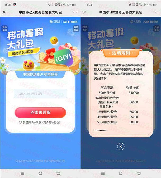 中国移动暑假大礼包活动抽500M-4G流量、1-5元手机话费
