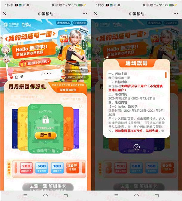 中国移动动感校园活动集拼图领10元话费券 充50元话费可使用