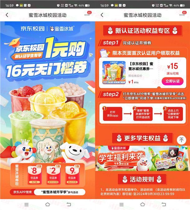 京东首次学生认证领满16减15元蜜雪冰城券 可1元喝蜜雪冰城