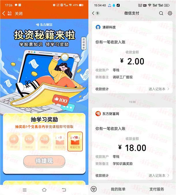 东方财富投资秘籍抽8-18元现金红包 亲测中18元可提现到微信