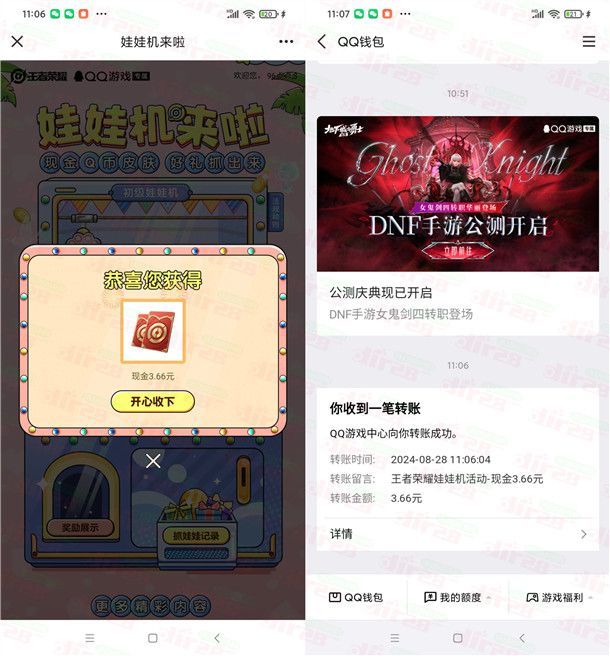 王者荣耀的新一期娃娃机活动又来了,跟以往类似的活动一样,手机QQ进去活动里开启任务,每个人的任务不同,有的任务很简单只要登录就行,完成指定的任务可以获得多次抽奖机会,有机会中到1.66-66.66元现金红包、Q币,小编测试中到3.66元现金红包秒到QQ钱包余额里,非必中。