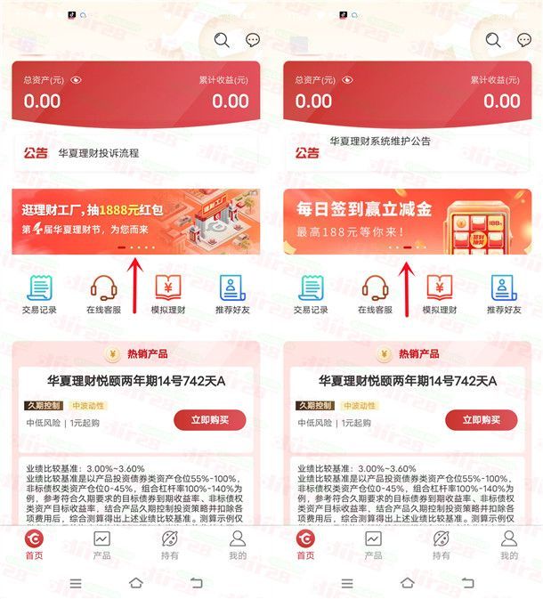 小编提示:注册过华夏理财或者华夏银行的去,打开“华夏理财”APP,首页点顶部滚动横幅【进理财工厂抽1888元红包】和【每日签到赢立减金】进去(这2个活动都可以去),每天都能抽,中到的现金红包秒到支付宝,非必中