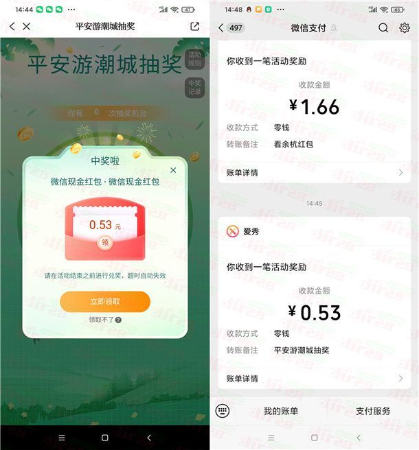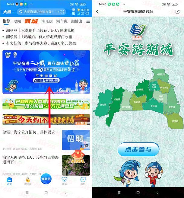 参加大潮举办的平安游潮城小互动抽红包活动,通过下载打开大潮APP进去活动里,关掉视频可以直接抽奖1次,3题全部答对还可以抽2次,有机会中到随机金额的微信红包,小编测试中到0.53元红包秒推,如果没中可以换号参加,非必中。