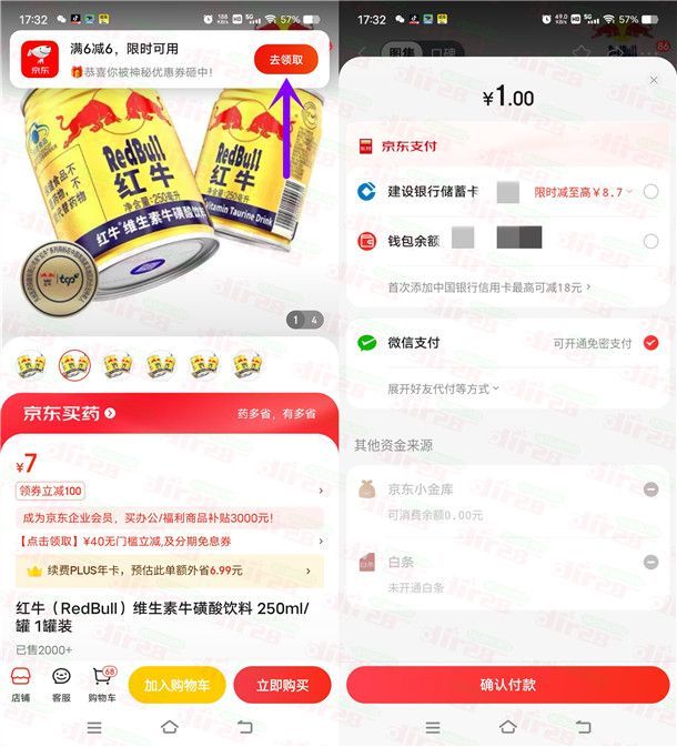 京东1元购买1瓶红牛饮料包邮 简单领取6元优惠券活动