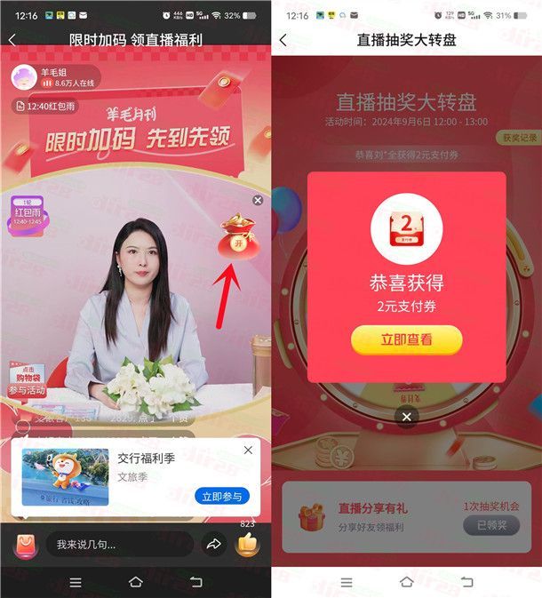 参加交通银行举办的羊毛月刊限时加码抽最高18元支付券活动,通过打开交通银行APP进去直播间活动里,在直播间点击右侧福袋图标进去,完成一个简单的分享抽,必中2-18元支付券红包,小编测试中到2元,这个活动需要在今天12:00-13:00之间参加,数量限量。