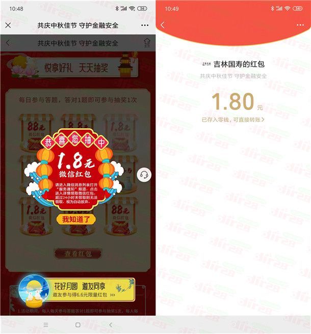 吉林国寿共庆中秋佳节答题抽1.8-88元微信红包 亲测中1.8元