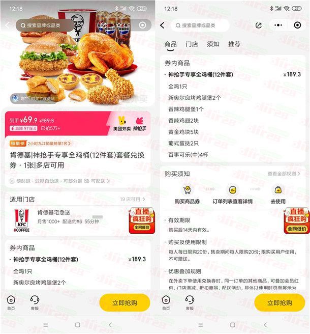 美团69.9元购买肯德基全鸡桶12件套 可点外卖核销使用