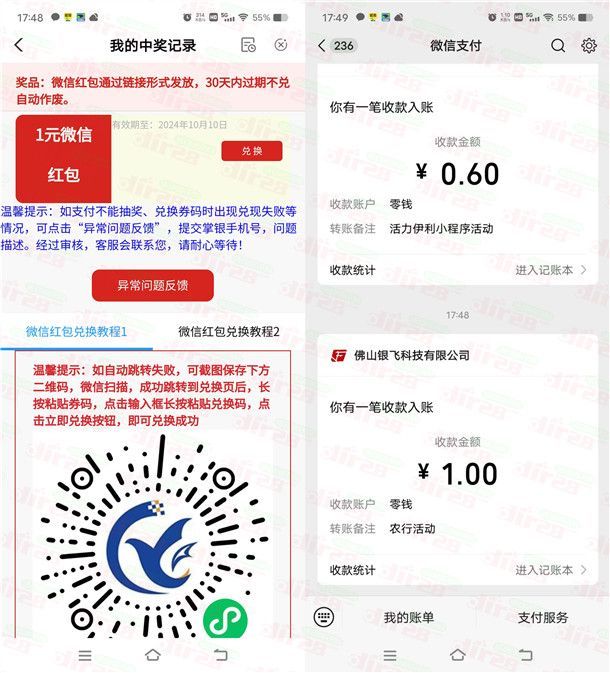 小编提示:全国都可以去,部分用户如果提示非受邀就参加不了,微信扫码跳转到中国农业银行APP活动里,里面3个活动都可以去,每支付1.5元可以抽奖1次,支付的钱会原路退回不会反撸,可以中多次红包