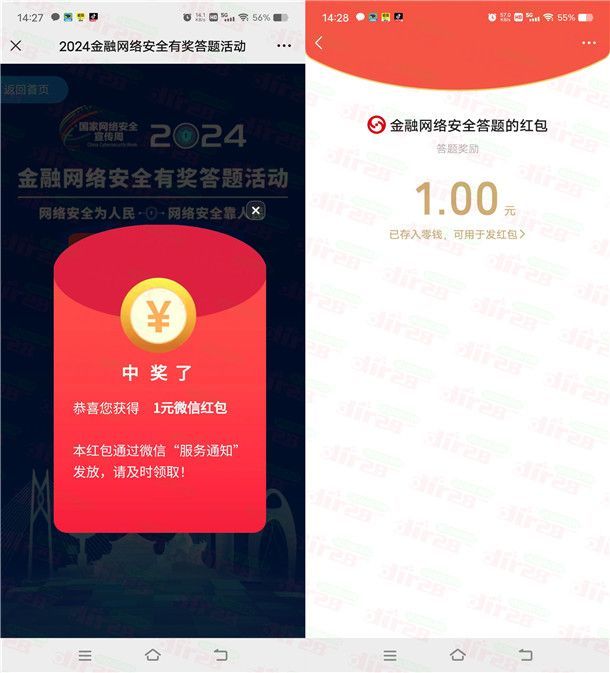 参加东莞银行举办的2024年国家网络安全宣传周-金融网络安全有奖答题抽红包活动,通过打开微信进去活动里,每人每天3次答题机会,每次答题随机从题库中抽取5道题,5道题全部答对即可抽奖1次,有机会中到1-10元微信红包,一共有10万多个红包,小编测试中到1元,非必中。