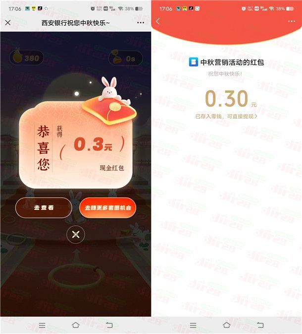 西安银行中秋套圈挑战赛抽0.3-66元微信红包 亲测中0.3元