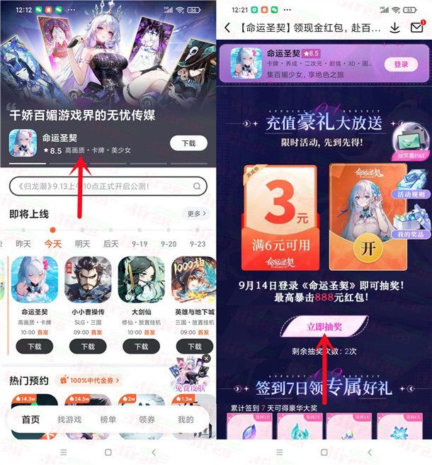 2、打开“九游”APP,首页点顶部滚动图【命运圣契】进去,下载游戏安装登录一次游戏,再重新进去活动里就可以抽奖2次,刚中0.5元,秒到支付宝,数量限量,游戏安装包只有400多M