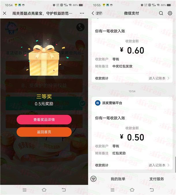 参加财信证券举办的金融教育宣传月闯关答题抽红包活动,通过打开微信进去活动里,总共5道测试题,答对4题及以上就可以获得1次抽奖机会,每人每天最多可以抽3次,有机会中到0.5-188元微信红包,小编测试第3次机会中到0.5元,非必中。