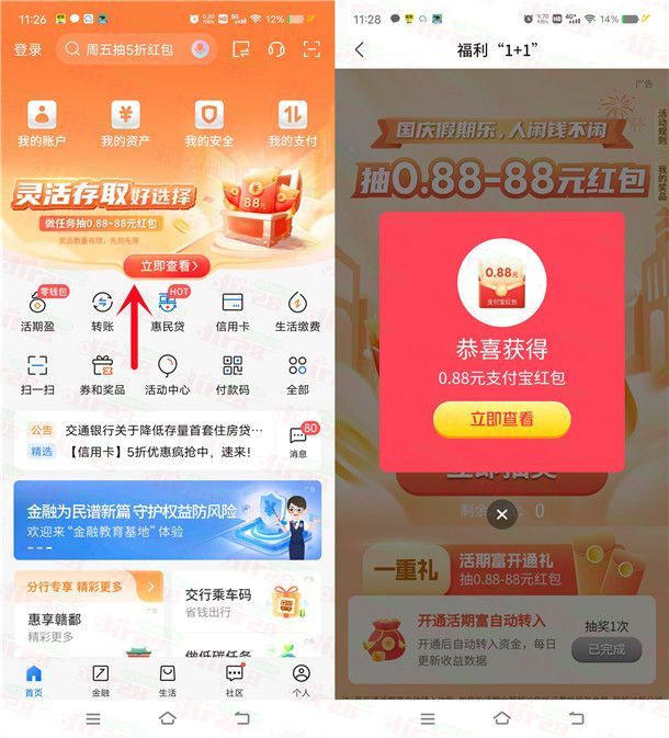 交通银行国庆假期乐抽0.88-88元支付宝红包 亲测中0.88元