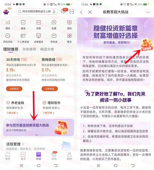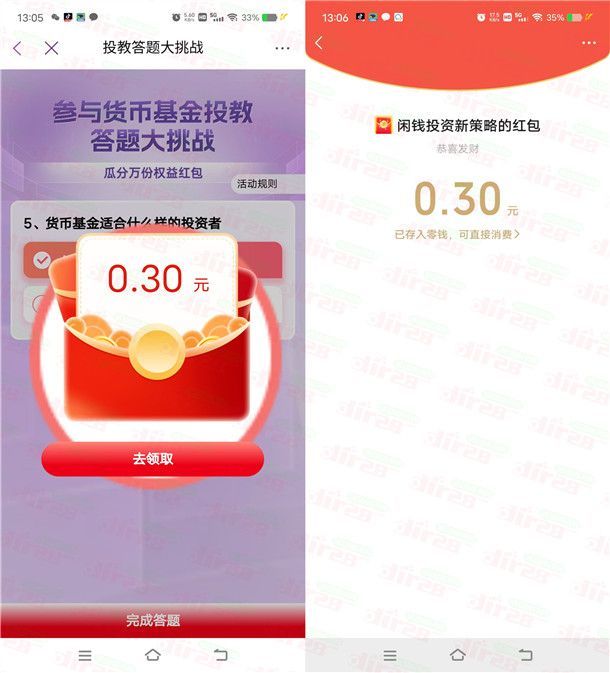 参加光大银行举办的货币基金投教答题大挑战抽红包活动,通过打开光大银行APP点底部“财富”再点右侧图标“投教福利最高88元”进去,完成几道简单的答题抽奖(答案一般都选A,如果打错了可以重新答),有机会中到0.3-88元微信红包,小编测试中到0.3元。