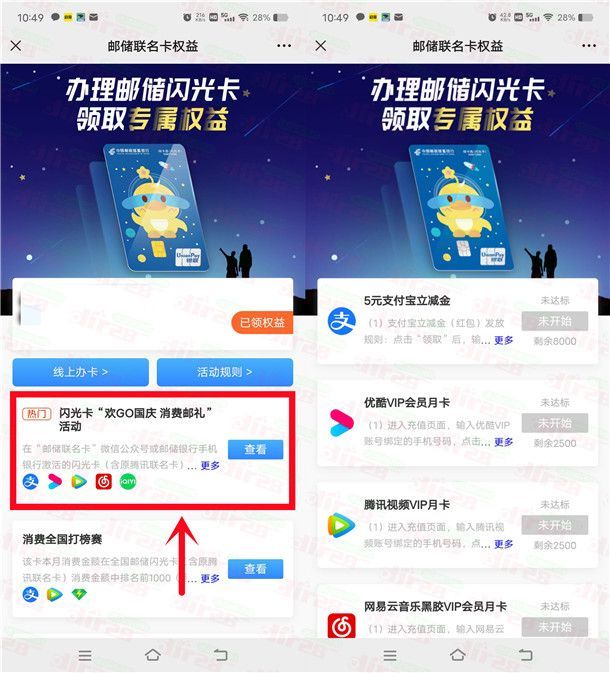 邮储闪光卡欢GO国庆领5元支付宝红包、腾讯视频、爱奇艺会员