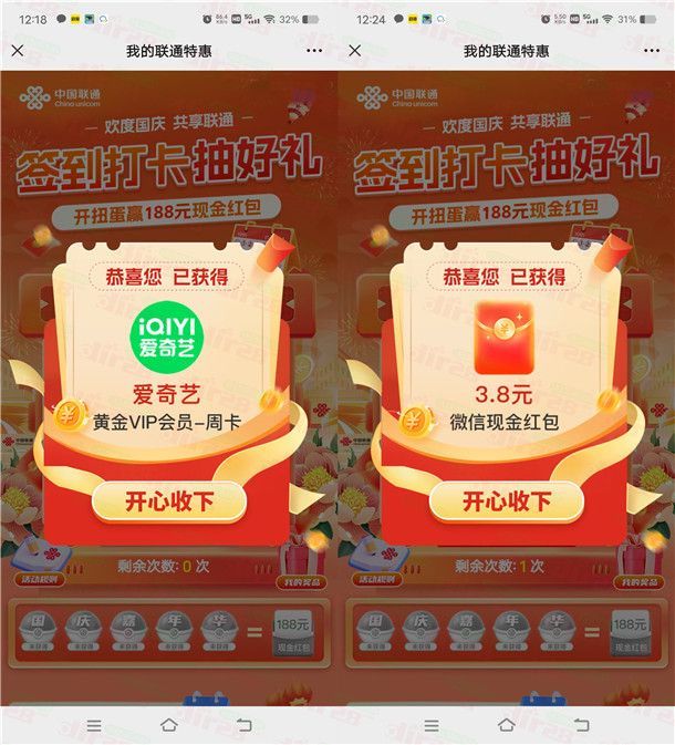 参加江西联通举办的欢度国庆签到打卡抽好礼开扭蛋赢188元现金红包活动,通过打开微信进去活动里,进去登录你的中国联通手机号码参加,每天签到后都可以抽奖1次,有机会中到随机金额的微信红包、各大视频会员,小编测试中到3.88元微信红包+爱奇艺会员周卡。