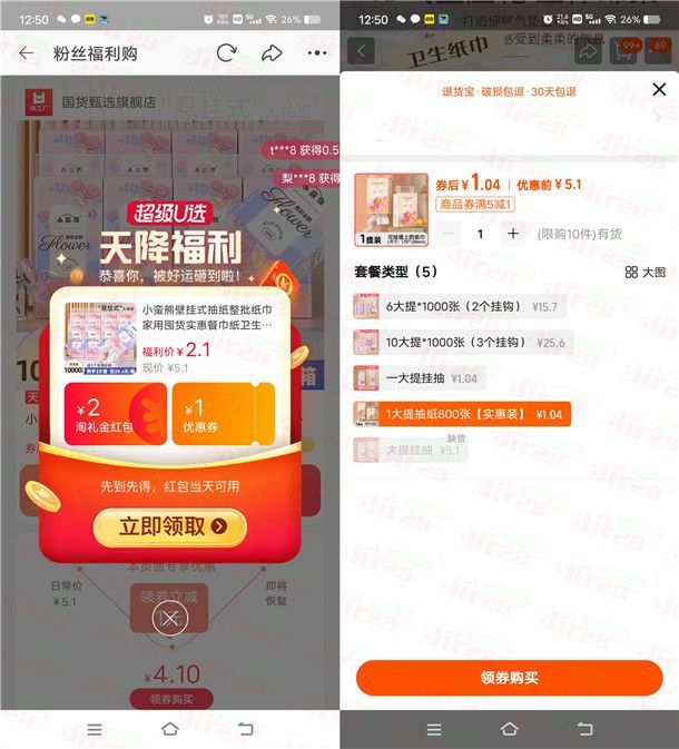- 7京东直播间简单0.01元撸一包云柔抽纸包邮 限时领红包活动
