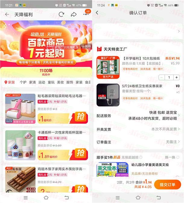 淘宝天降福利每天1元撸各种实物商品 每天11点补充库存