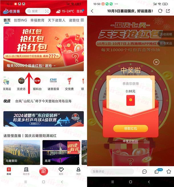 参加西施眼举办的喜迎国庆天天抢红包活动,通过下载打开西施眼APP,首页点顶部滚动图“抢红包”进去,每个号每天都可以抽1次,有机会中到随机金额的微信红包,小编测试中到0.88元秒推微信零钱,如果没中可以第二天再去或者换号抽,非必中。