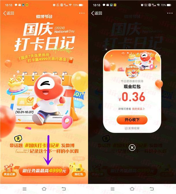 微博国庆打卡日记抽最高4999元现金红包 亲测中1.12元 可抽多次