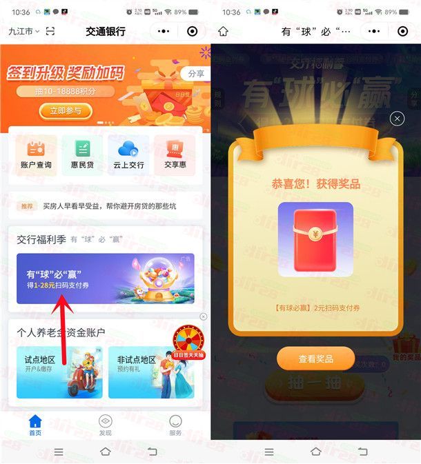 交通银行有球必赢必中1-28元支付券红包 亲测中2元可变现