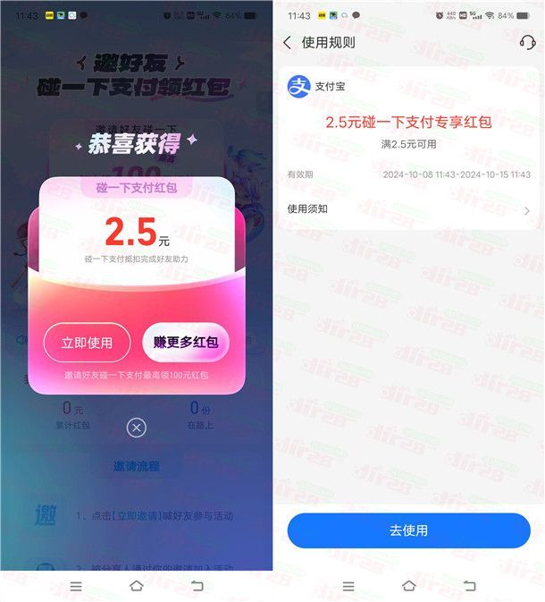 参加支付宝举办的每天领最高100元红包活动,通过打开支付宝APP扫描二维码进去活动里,点击弹窗可以领到最高100元支付宝碰一下红包,每天都可以领1次,金额随机,小编测试领到2.5元,得到的红包可以用打开手机NFC,用支付宝APP碰一下支付就可以用掉,在线下支持碰一下支付的门店、超市都可以用掉。