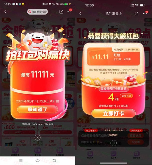京东双11超级红包 每天必中1个超级现金红包 最高11111元