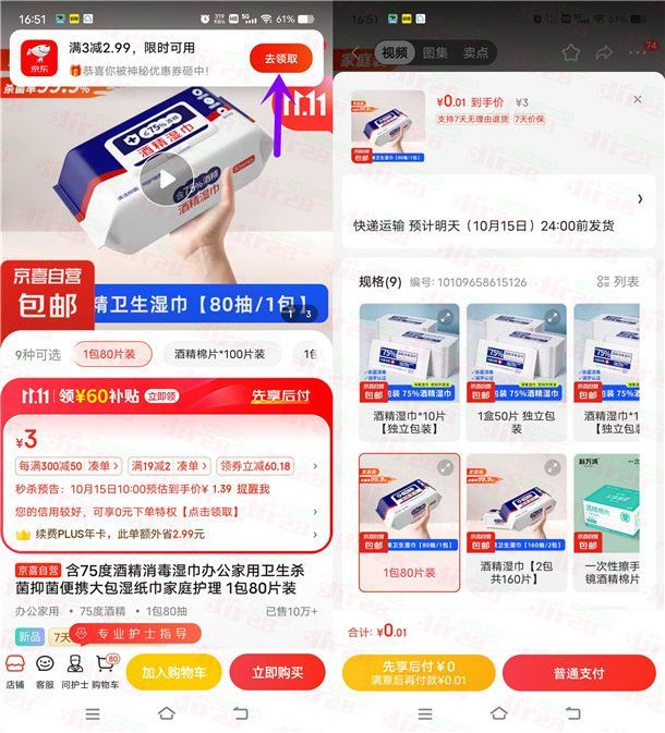 京东0.01元购买1包酒精湿巾包邮 简单领2.99元券活动
