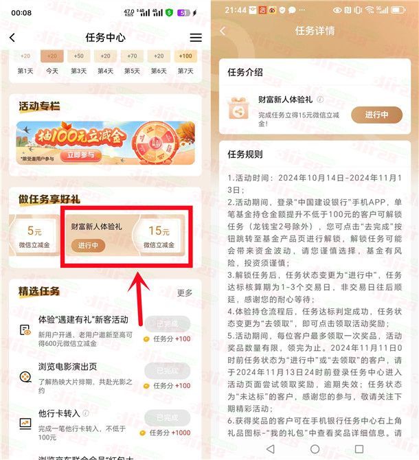 小编提示:这个活动只有部分用户才可以参加,打开“中国建设银行”APP,在【我的】页面点【任务中心】进去,下拉页面如果有显示【财富新人体验礼】的盲盒任务,就按照提示买入100元理财就可以领到15元微信立减金,买入的理财有延迟,买低风险的就行,如果没有这个任务就参加不了