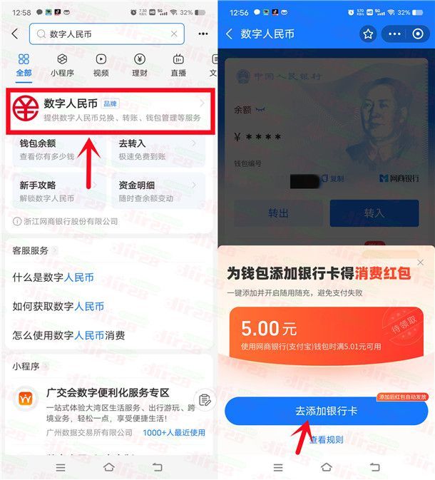 1、打开支付宝APP搜索【数字人民币】进去,如果底部有弹窗提示为钱包添加银行卡送5元红包就可以参加(如果没有这个弹窗就参加不了)