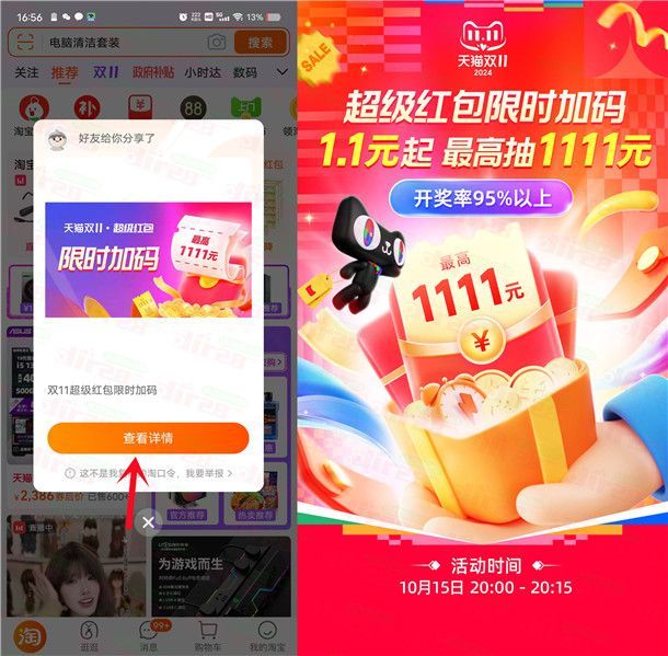 今天淘宝20点整双11加码超级红包 必中1.1元以上红包