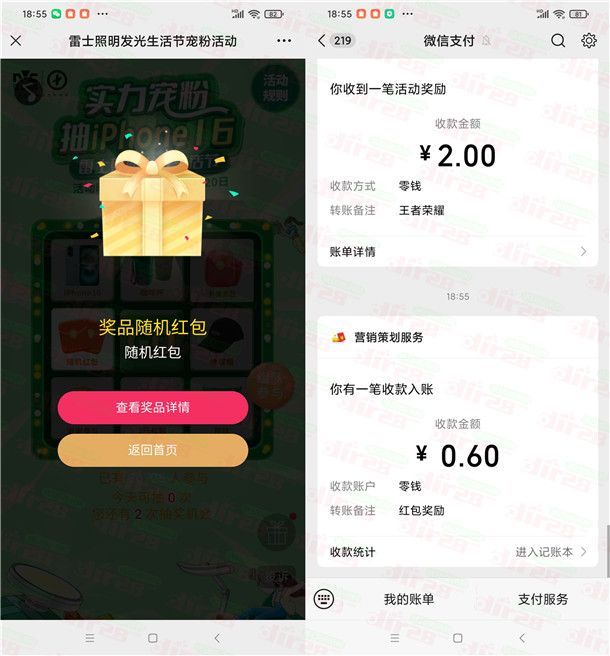 雷士照明实力宠粉活动抽随机微信红包、实物 亲测中0.6元