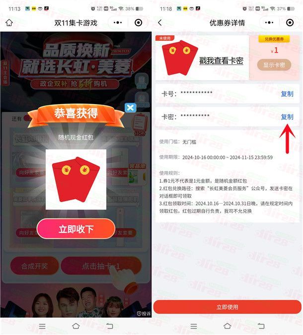 长虹美菱双11集卡活动抽随机微信红包 亲测中1.4元秒推